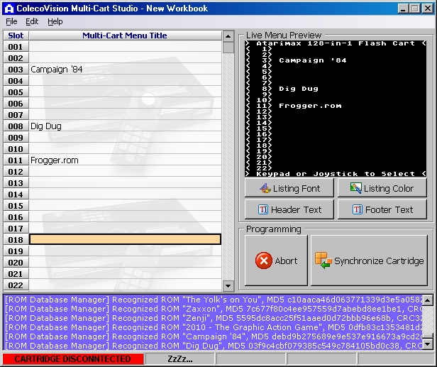 Installing games into the multicart is easy. You simply drag ROMs (a.k.a. BINs) from Explorer to Coleco Studio. The games are automatically recognized and titled but can easily be renamed. There are options allowing you to alphabetically sort the menu and compact the menu removing blank spaces between titles. Arrange the menu by dragging the games from position to position. The Live Menu Preview shows you exactly what you will see on the TV when the cart is plugged into the console. With full control over the menu header, footer, text color, and font, customize the menu appearance to your liking. Once you have the menu as you want it, connect the multicart to the PC and click on the Synchronize button. There is an alternative, non-intuitive way to perform some functions. You simply right click on a slot to display a popup menu.